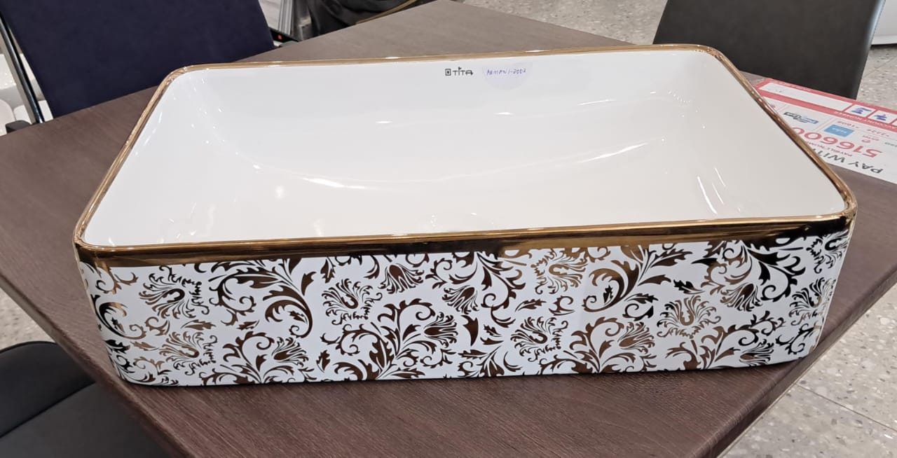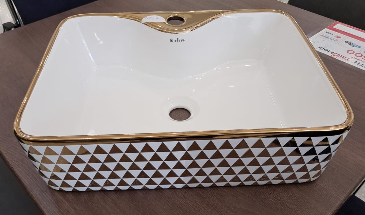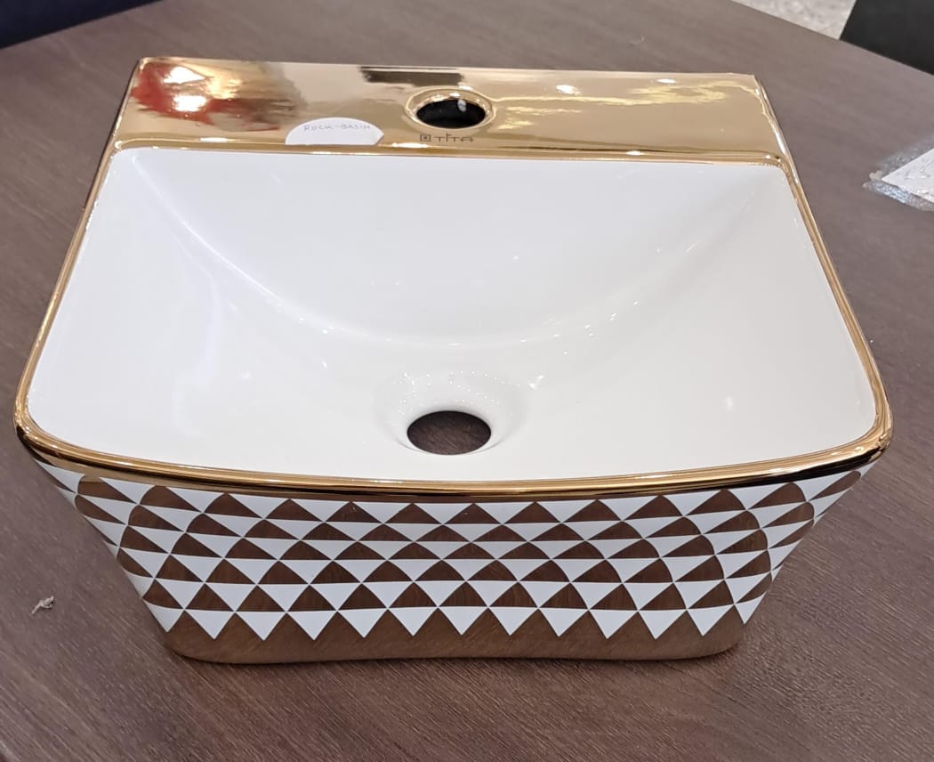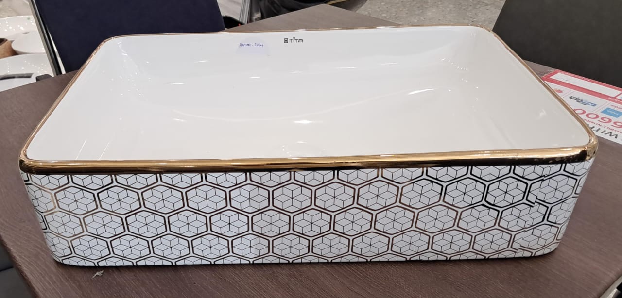 Add a touch of luxury to your space with this premium countertop handwash basin. It features a modern rectangular design, a glossy white interior, gold trim, and stylish geometric patterns on the exterior. Durable ceramic construction ensures long-lasting use, making it ideal for homes, hotels, salons, and offices.