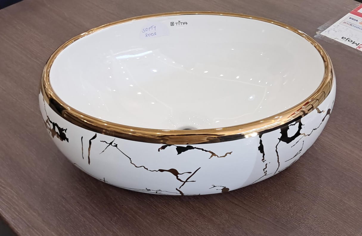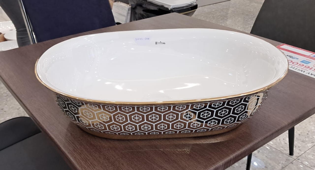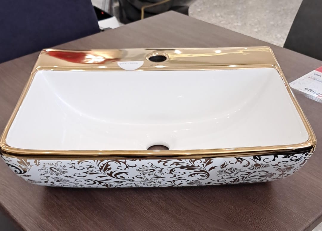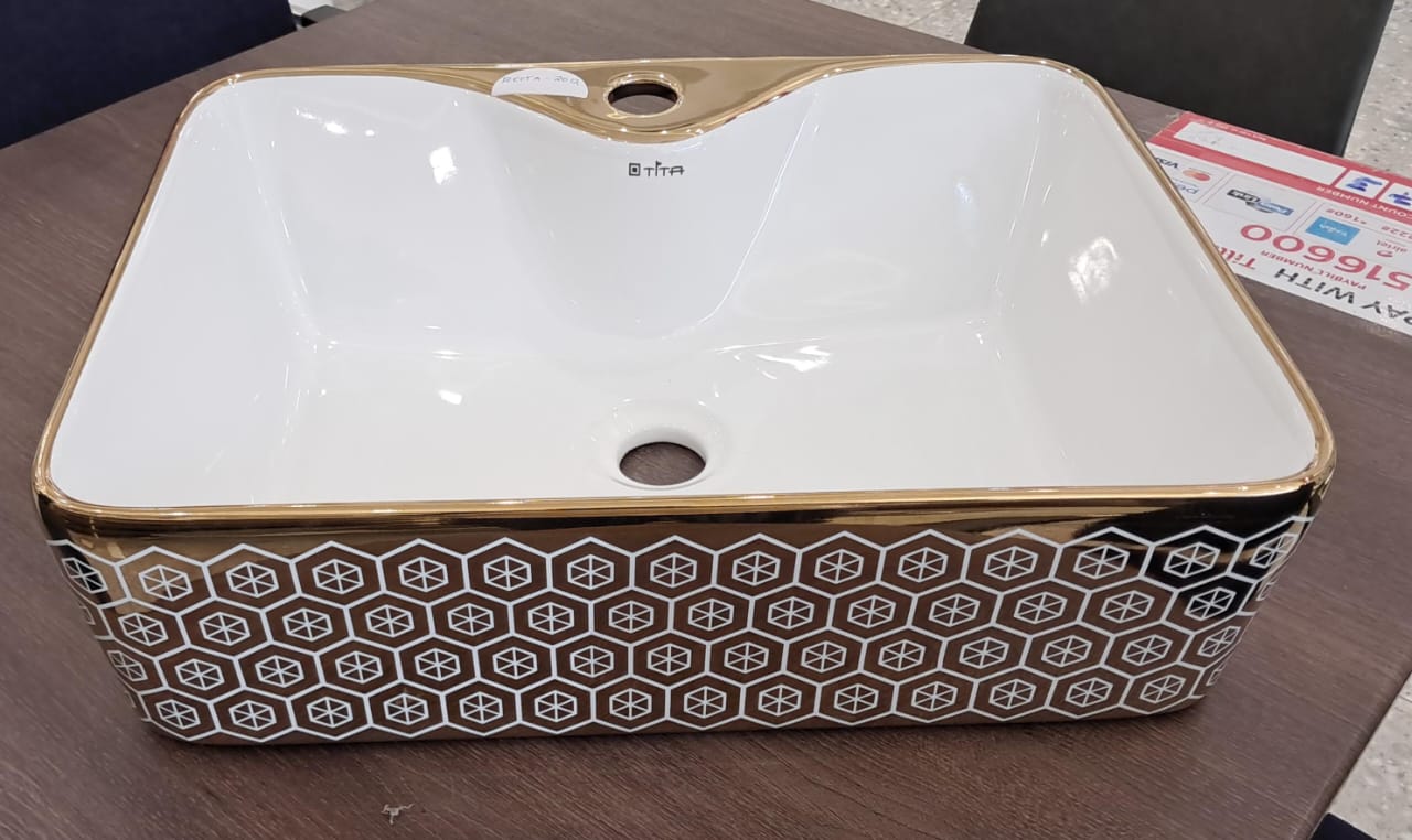 Add a touch of luxury to your space with this premium countertop handwash basin. It features a modern rectangular design, a glossy white interior, gold trim, and stylish geometric patterns on the exterior. Durable ceramic construction ensures long-lasting use, making it ideal for homes, hotels, salons, and offices.